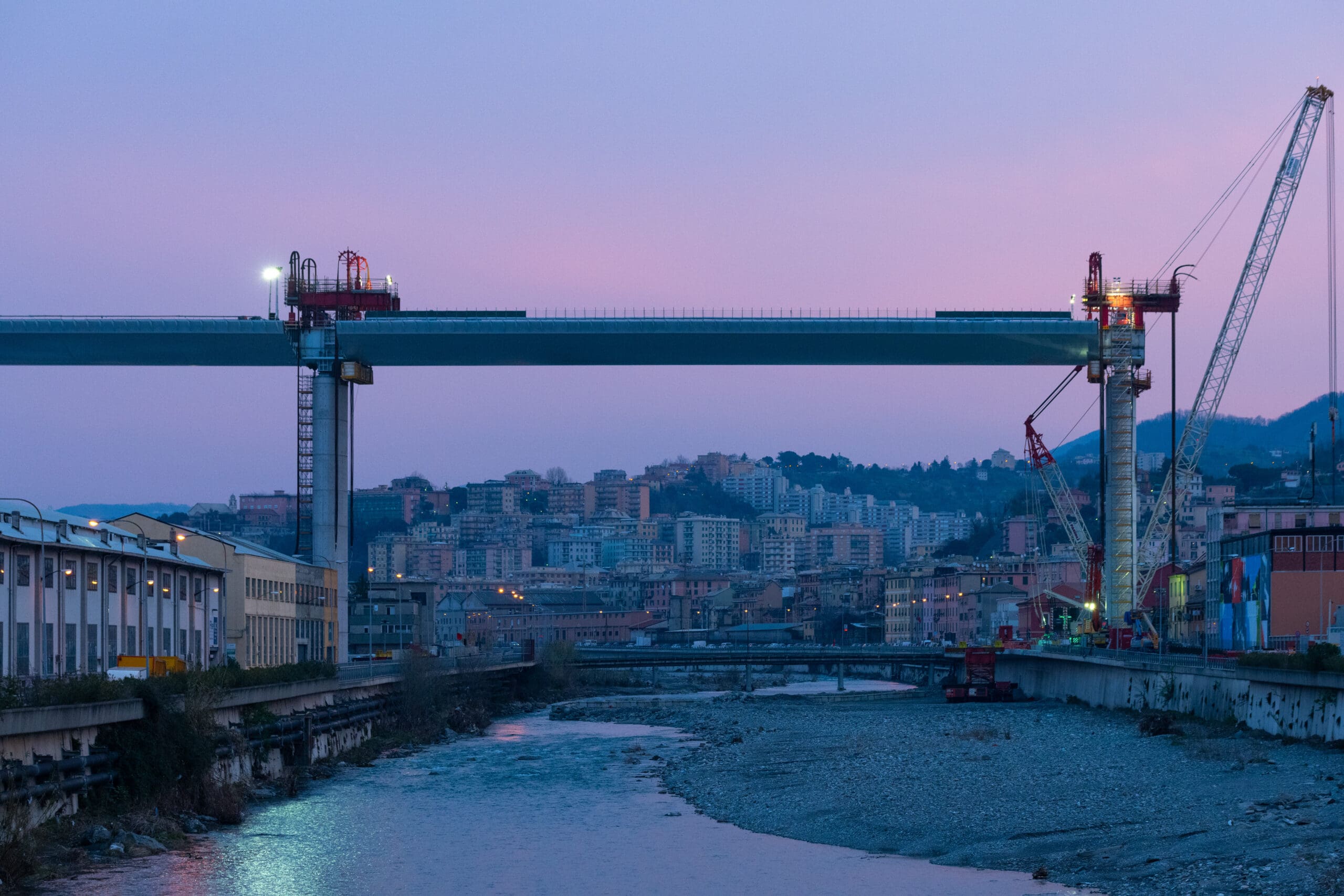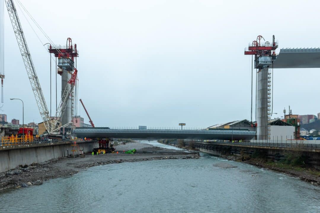 Il tratto di impalcato posizionato è quello che scavalca il torrente Polcevera, issato tra la pila 9 e la pila 10.