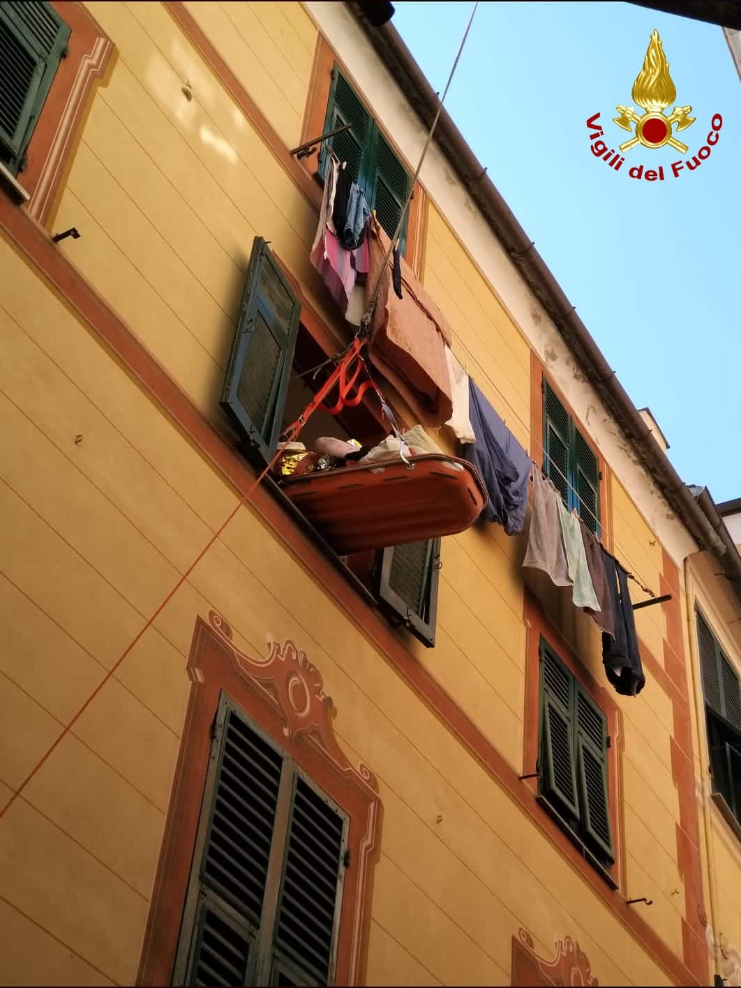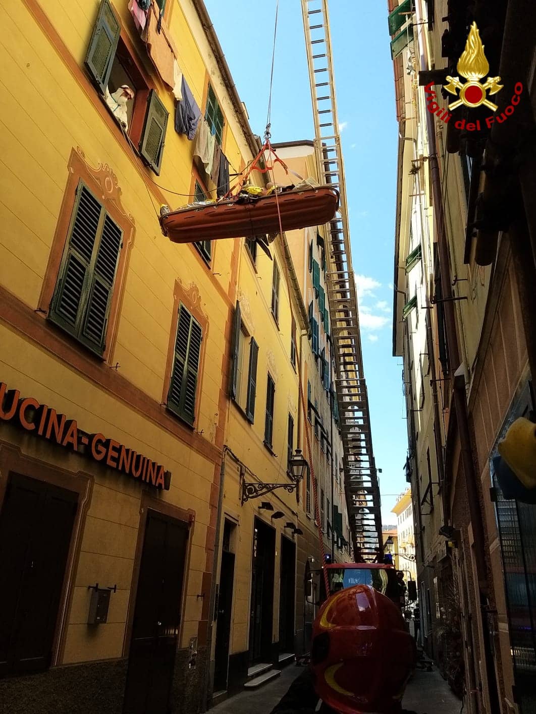 Santa Margherita Ligure (Genova) – Questa mattina i vigili del fuoco di Rapallo di sono recati a Santa Margherita Ligure, in via Cairoli, per assistenza al 118. Un uomo di circa 200 kg doveva essere trasportato all’ospedale. Impossibilitati a farlo scendere dalle scale si è optato per portarlo a piano strada tramite l’autoscala e la barella.