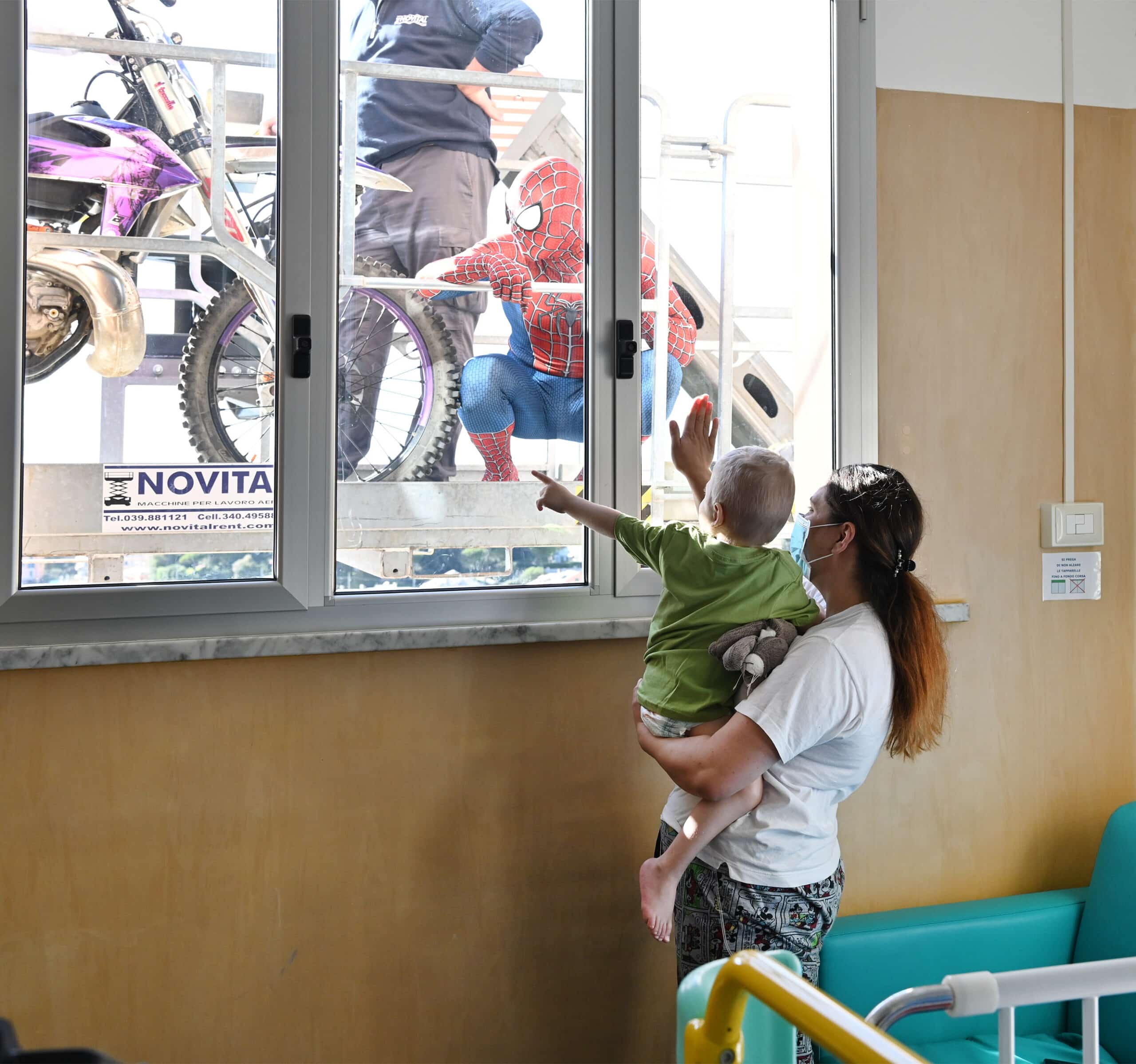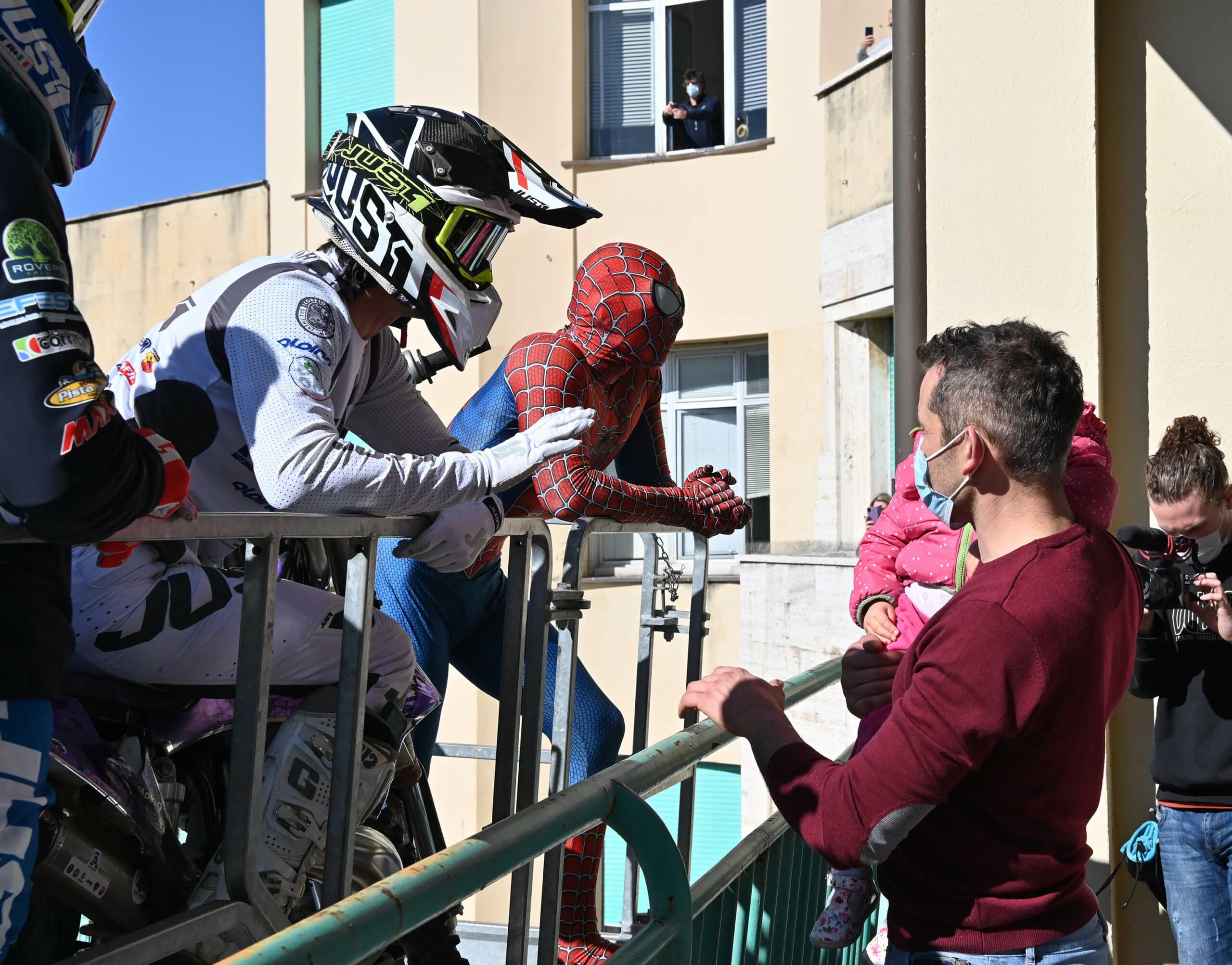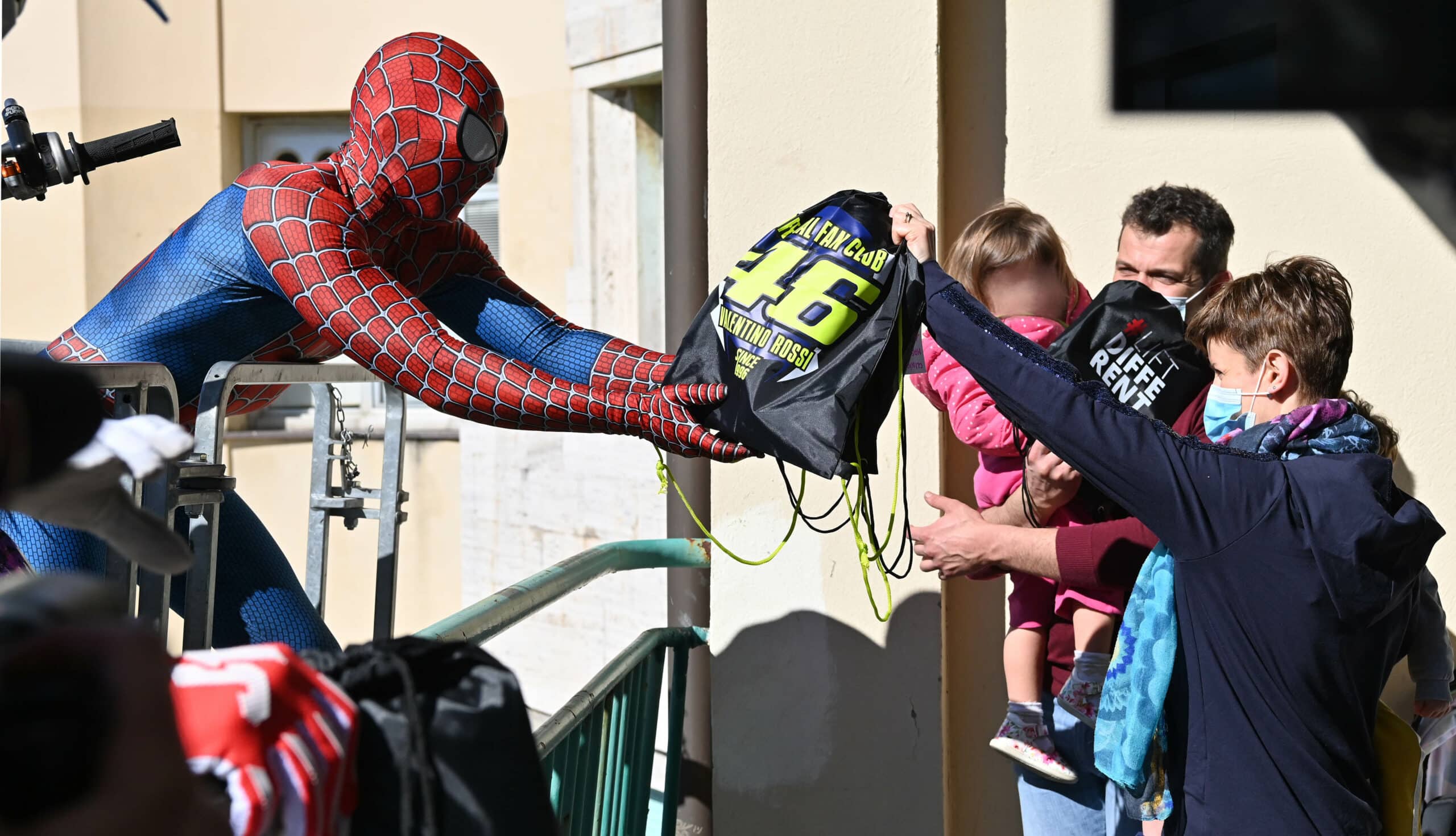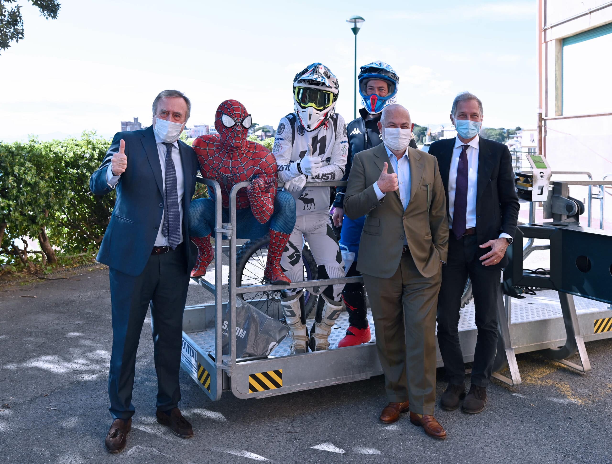 Una enorme gru ha issato il motociclista, accompagnato dal suo collega Maurizio Gerini e da Mattia Villardita, il giovane che indossa i panni di Spiderman per visitare i pazienti dell’ospedale pediatrico e che lo scorso dicembre è stato nominato Cavaliere al Merito dal Presidente della Repubblica Sergio Mattarella.