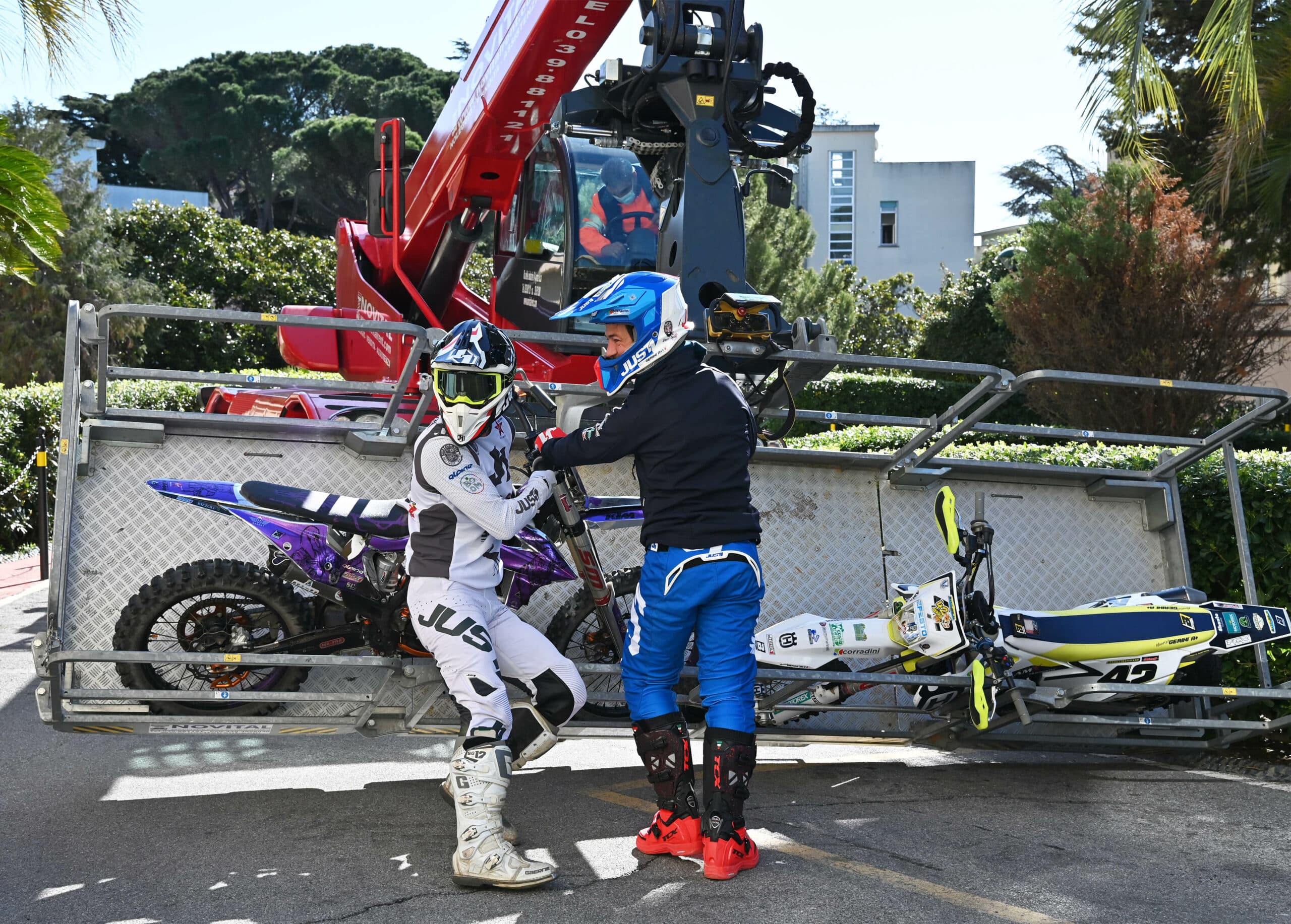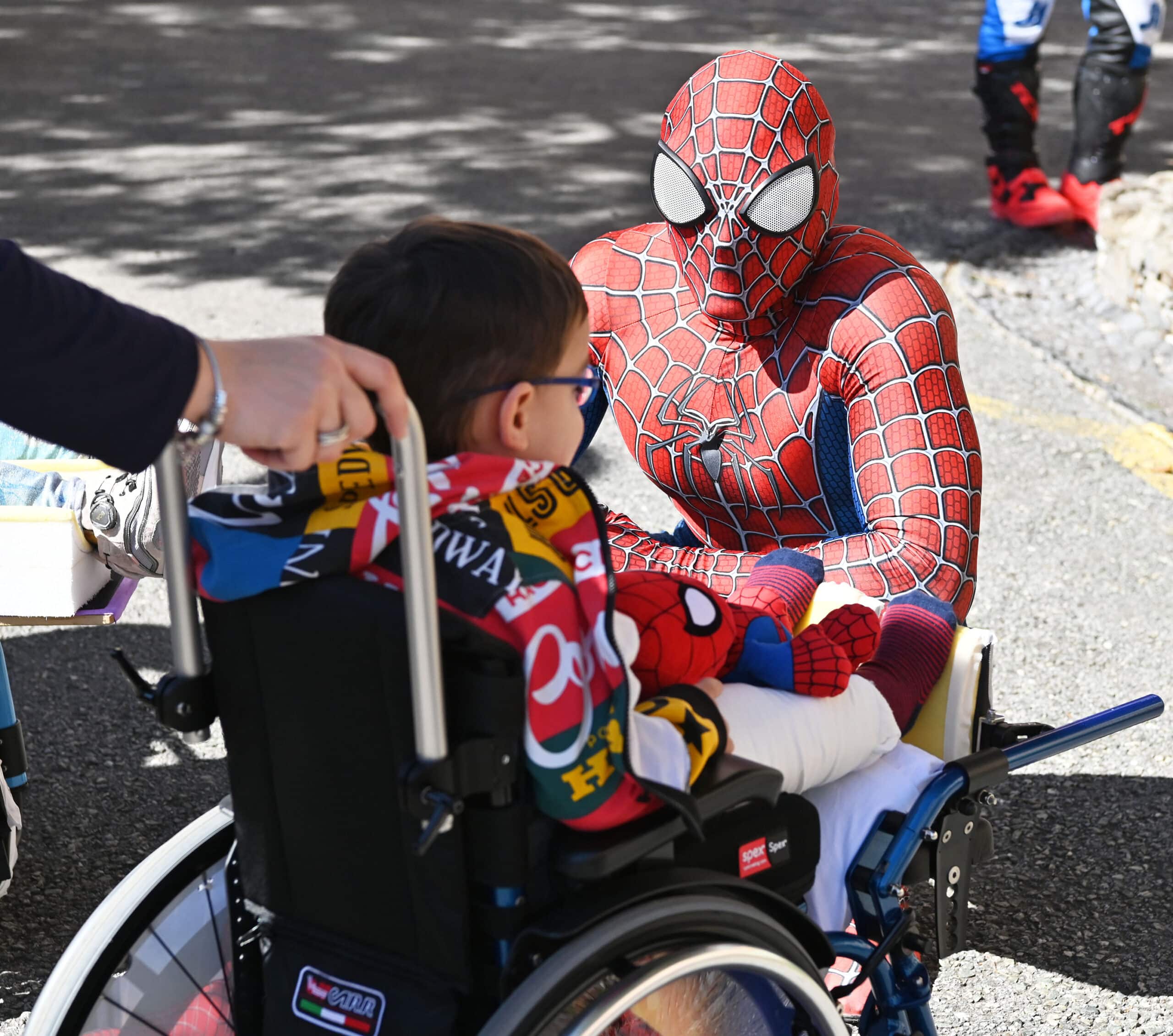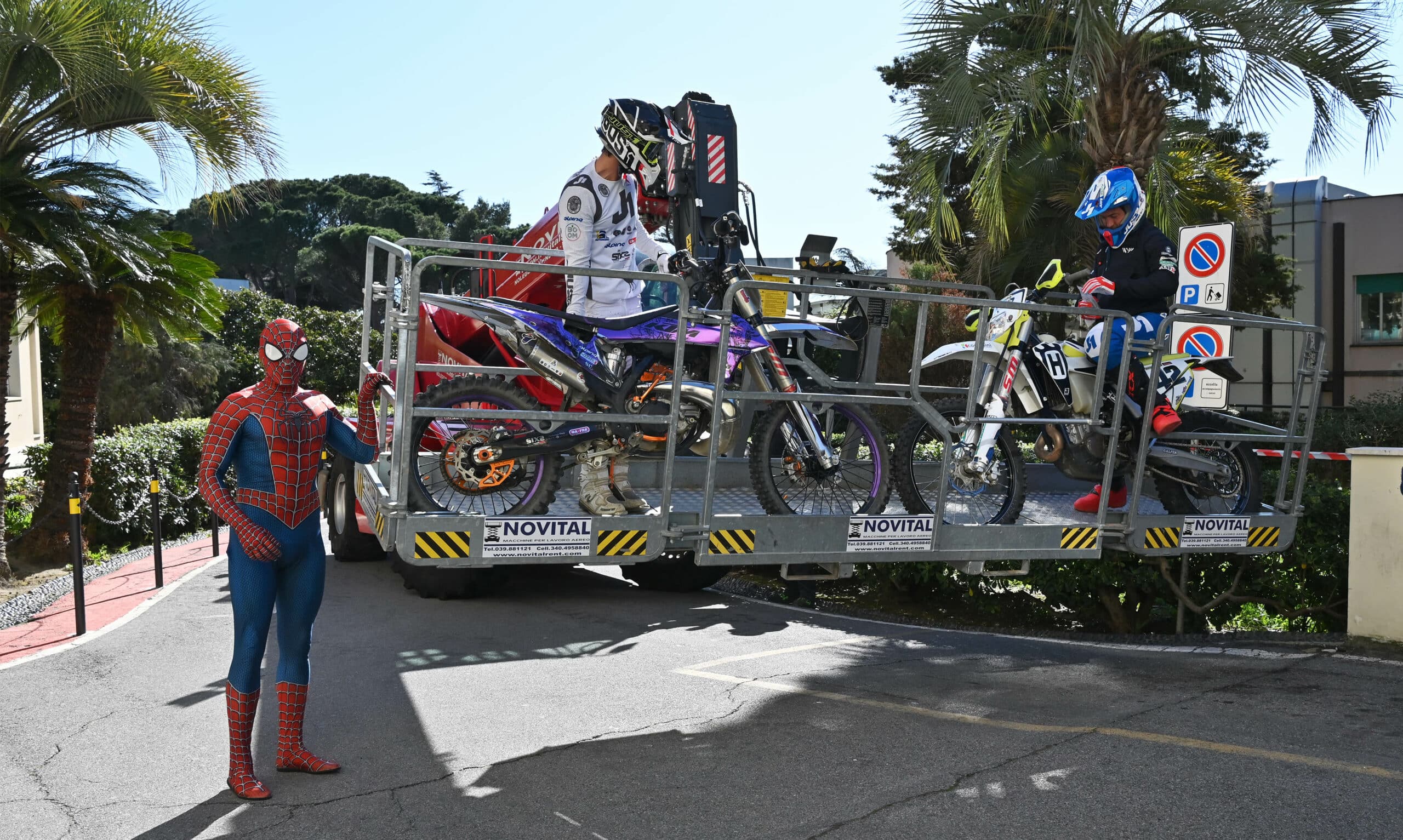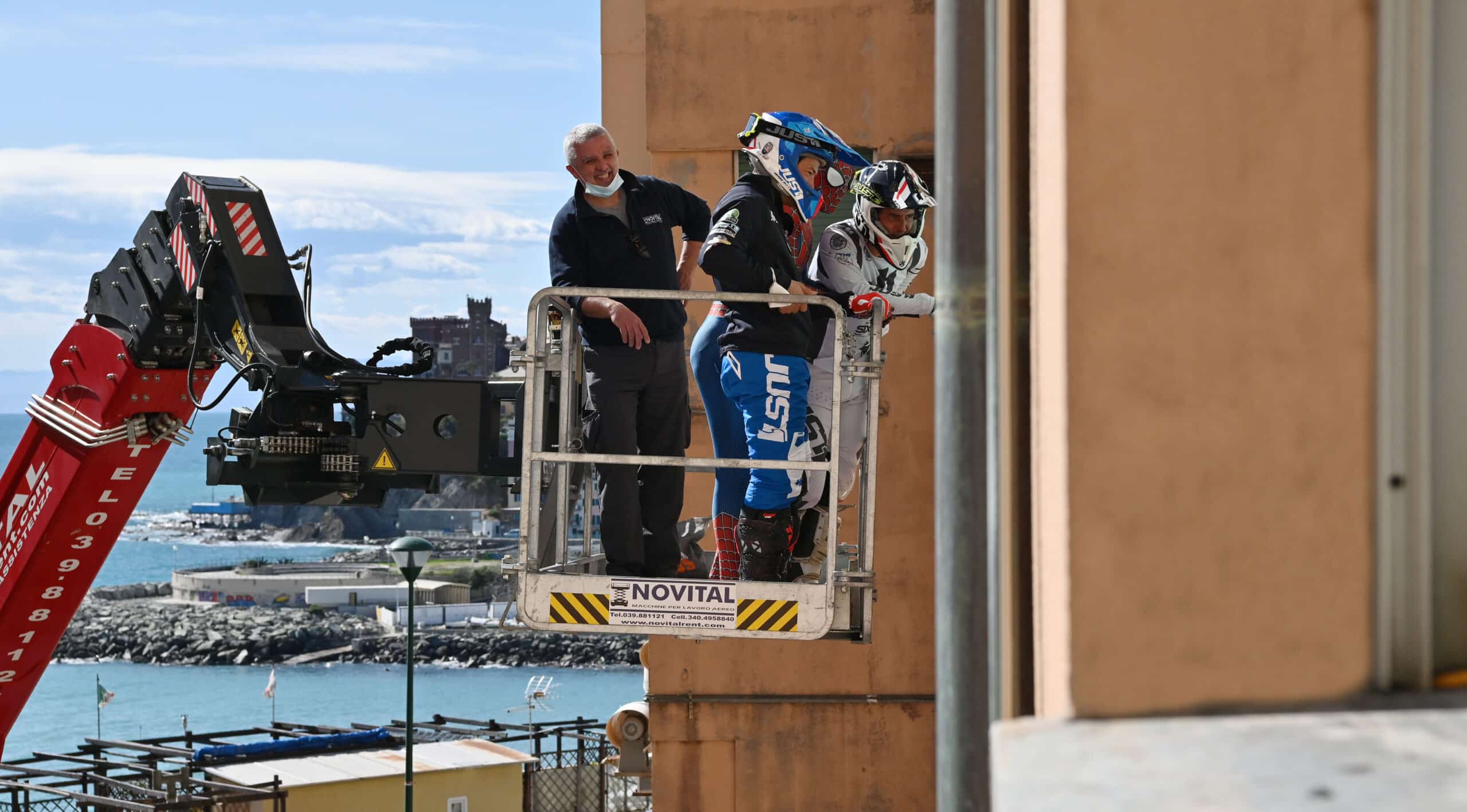 Una enorme gru ha issato il motociclista, accompagnato dal suo collega Maurizio Gerini e da Mattia Villardita, il giovane che indossa i panni di Spiderman per visitare i pazienti dell’ospedale pediatrico e che lo scorso dicembre è stato nominato Cavaliere al Merito dal Presidente della Repubblica Sergio Mattarella.