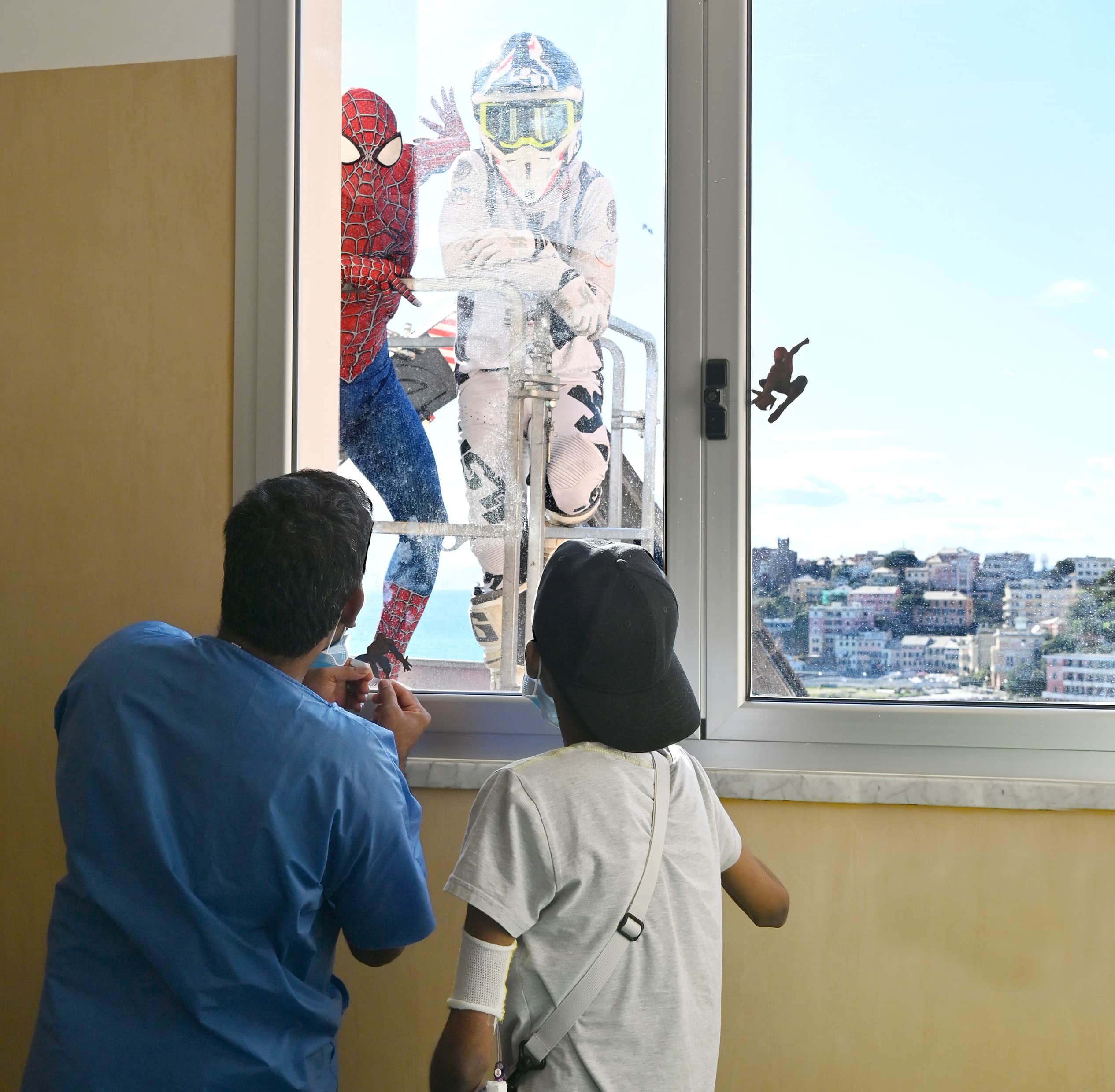 Genova – E’ stata una giornata di sorprese quella di oggi per i piccoli ricoverati dell’ospedale pediatrico Giannina Gaslini di Genova che oggi hanno visto spuntare dalla loro finestra Spiderman e il campione di Motocross Vanni Oddera.