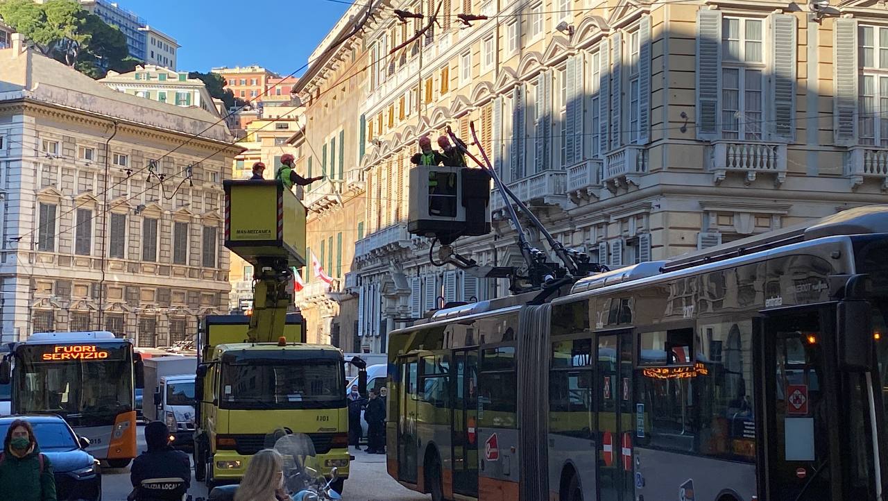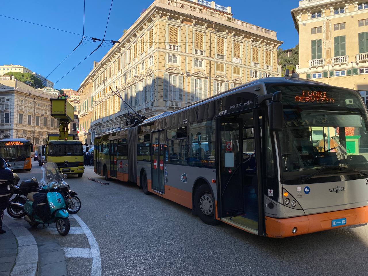 Genova – Traffico in tilt in piazza Fontane Marose per un filobus che ha agganciato un cavo della linea elettrica che corre sulla piazza.