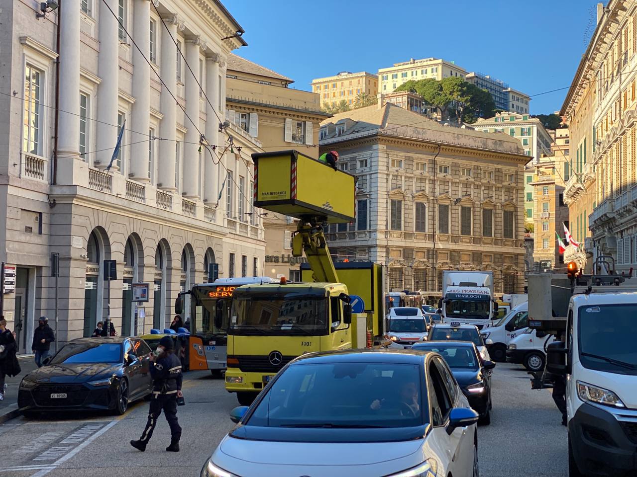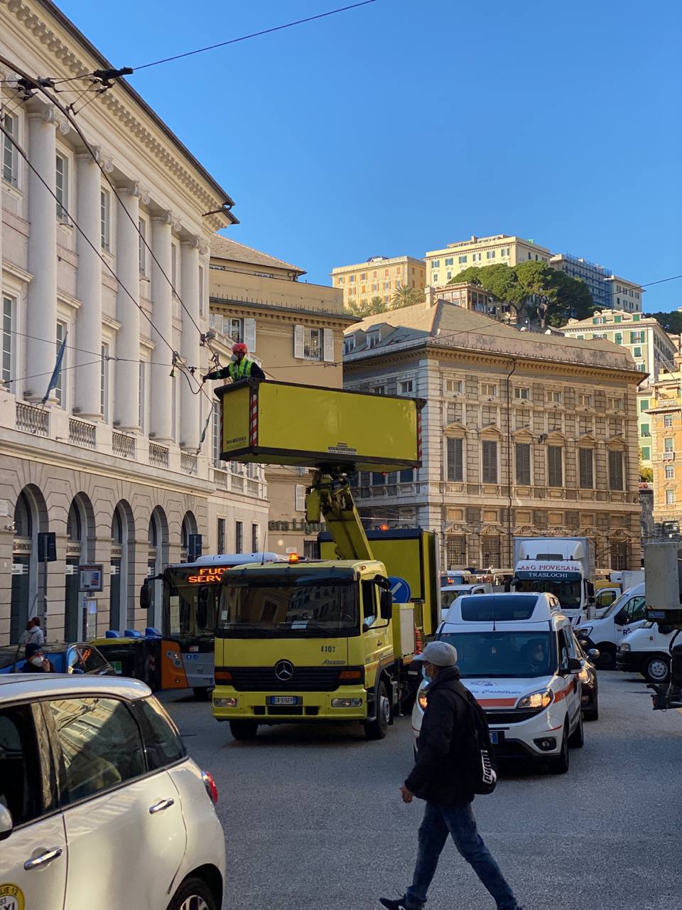 Il mezzo dell’Amt in servizio sulla linea 20, è rimasto bloccato verso via XXV Aprile, bloccando la circolazione veicolare e causando lunghe code di auto e bus dei veicoli provenienti sia dalla Galleria Bixio sia da Galleria Garibaldi.