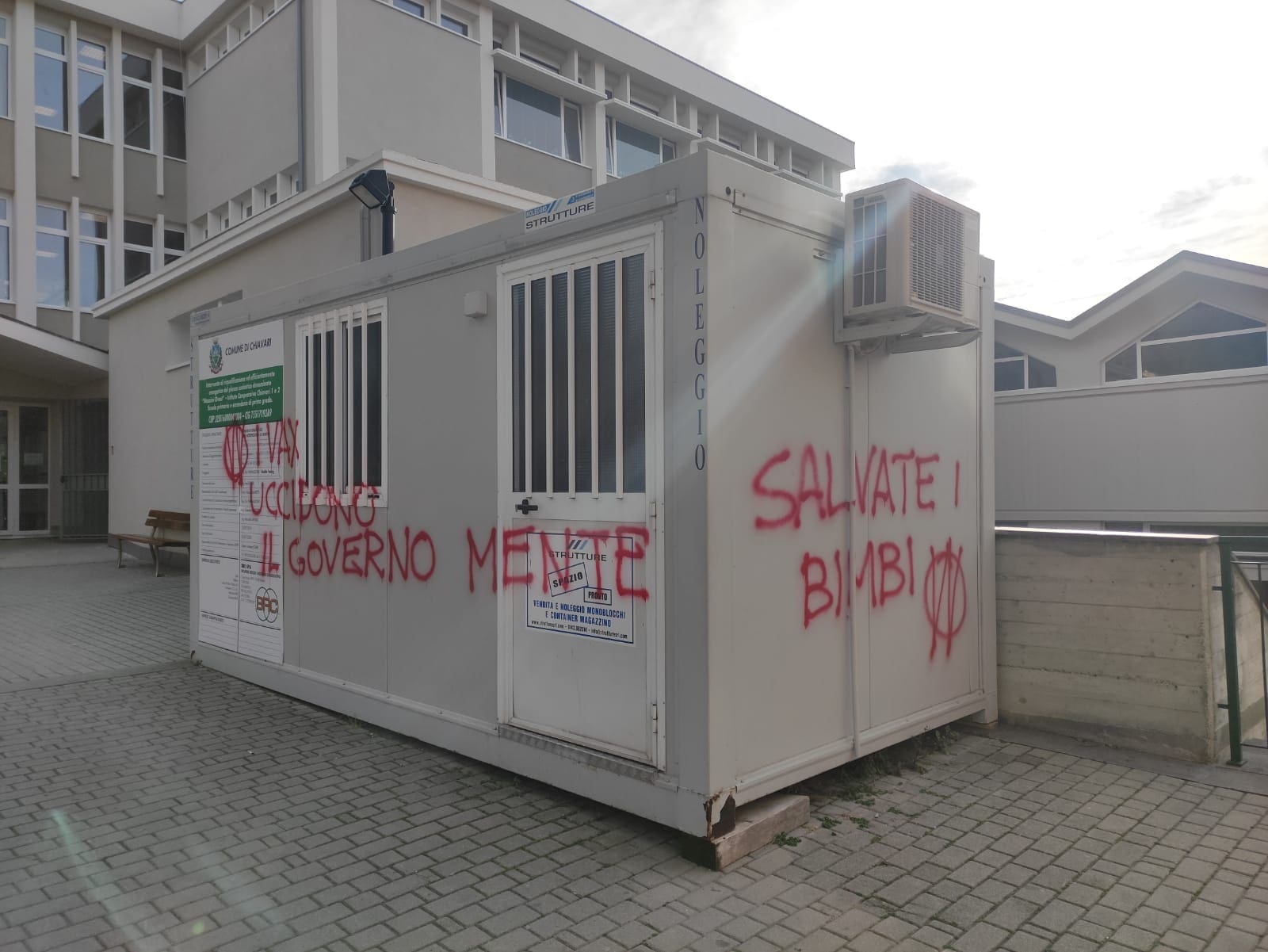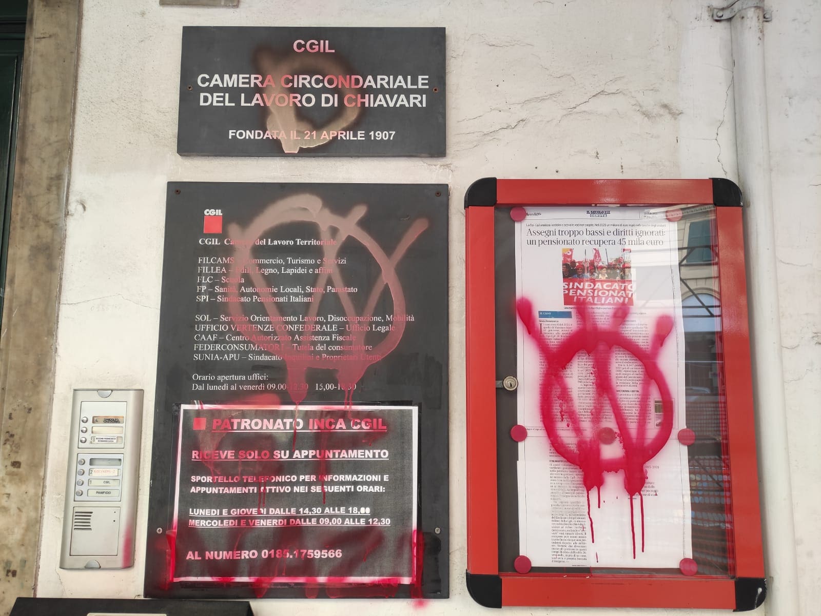 Chiavari (Genova) – Ancora scritte no vax a Chiavari.Questa mattina sono state trovate imbrattate di vernice rossa con la doppia V cerchiata le targhe della sede della CGIL, le scuole Mazzini Est, il circolo PD e l’hub vaccinale.
