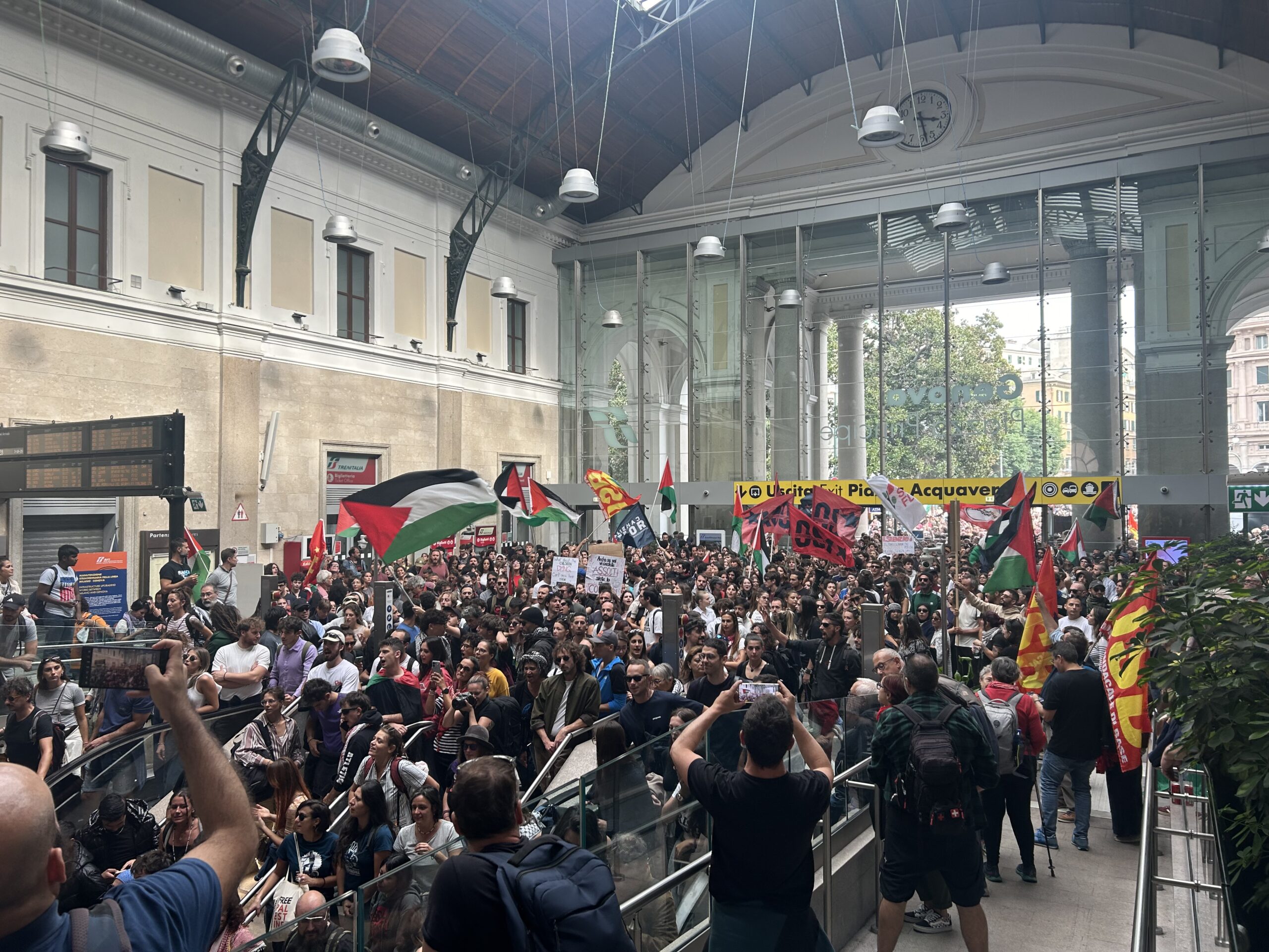 I manifestanti hanno dichiarato occupata la stazione genovese e hanno confermato come non la abbandoneranno fino a quando non si avranno notizie sulle condizioni dei cittadini italiani che si trovavano a bordo delle imbarcazioni della Global Sumud Flotilla e che sono stati arrestati dalla marina israeliana.